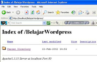 Perhatikan bahwa address bar menuju ke link  http://localhost/BelajarWordpress/. Itu artinya kalian telah berhasil membuat server web lokal atau Localhost. Agar nanti tampilan web ada isinya maka harus melanjutkan langkah Instalasi CMS WordPress pada Localhost atau Web Server Lokal.